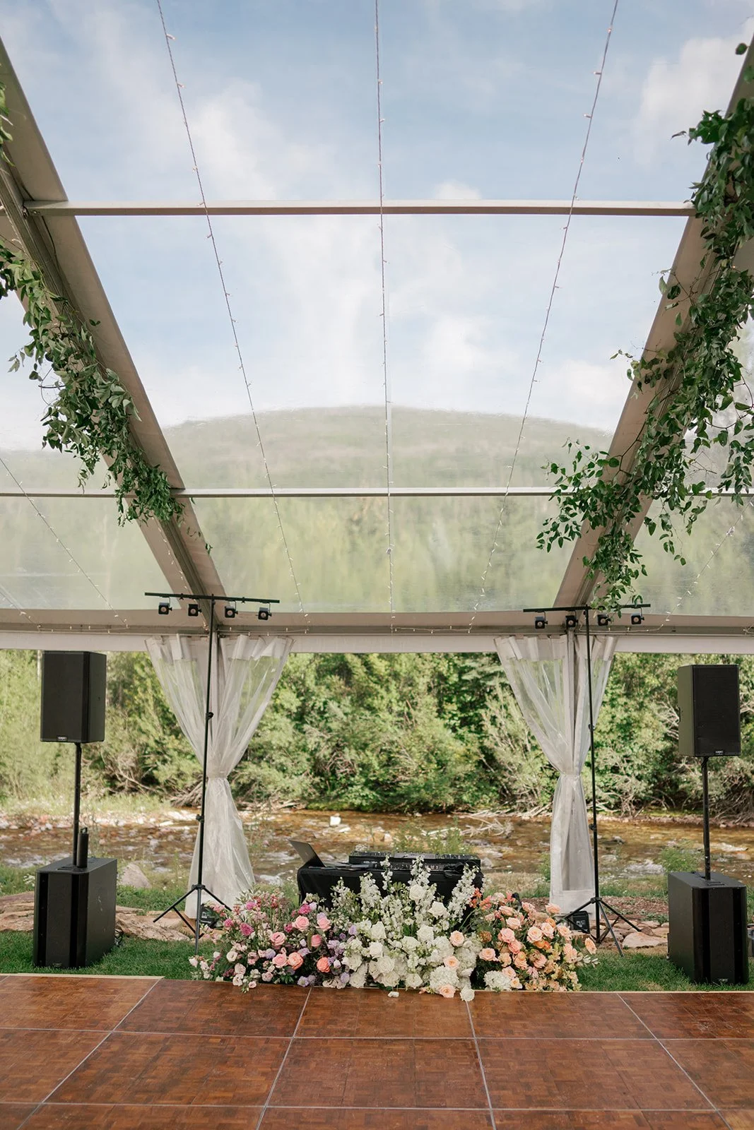 Very special day for Amanda + Patrick celebrating their wedding at a private ranch outside of Beaver Creek, CO. The ceremony was set in a breathtaking mountain landscape, where towering peaks frame a sweeping open field, and a gentle river meandered quietly through the valley below. The iconic clear tent was perfect for the reception, offering an unobstructed view of the night sky. In the tent, the atmosphere was magical, a perfect blend of natural beauty and elegant, colorful decor.